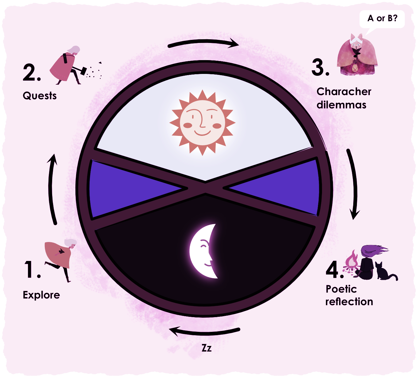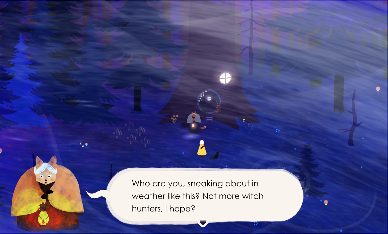 If your lucky you find a place to stay. But to stay, you must often help. Nothing is free on the road. The dark and cold winter is nearing and you often help creatures to make ready for the long winter.