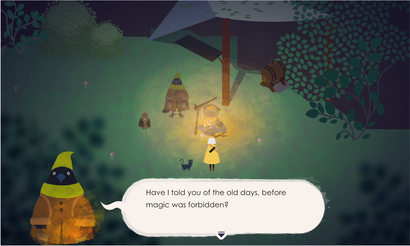 Before you arrive at a destination, you control Mio. He guides Mia through deep forests and tall mountains, always searching for a safe place to rest before nightfall. Hear Mio’s rusty, emotional thoughts and his view of the world, and talk with other creatures and animals.